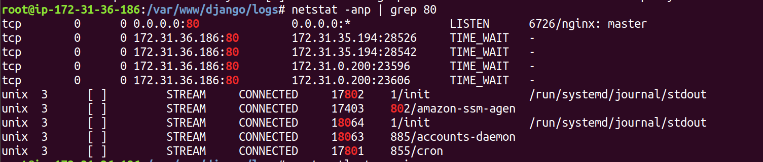 $ netstat -anp | grep 80 명령어를 사용해서 80번 포트를 사용하고 있는 프로세스를 확인