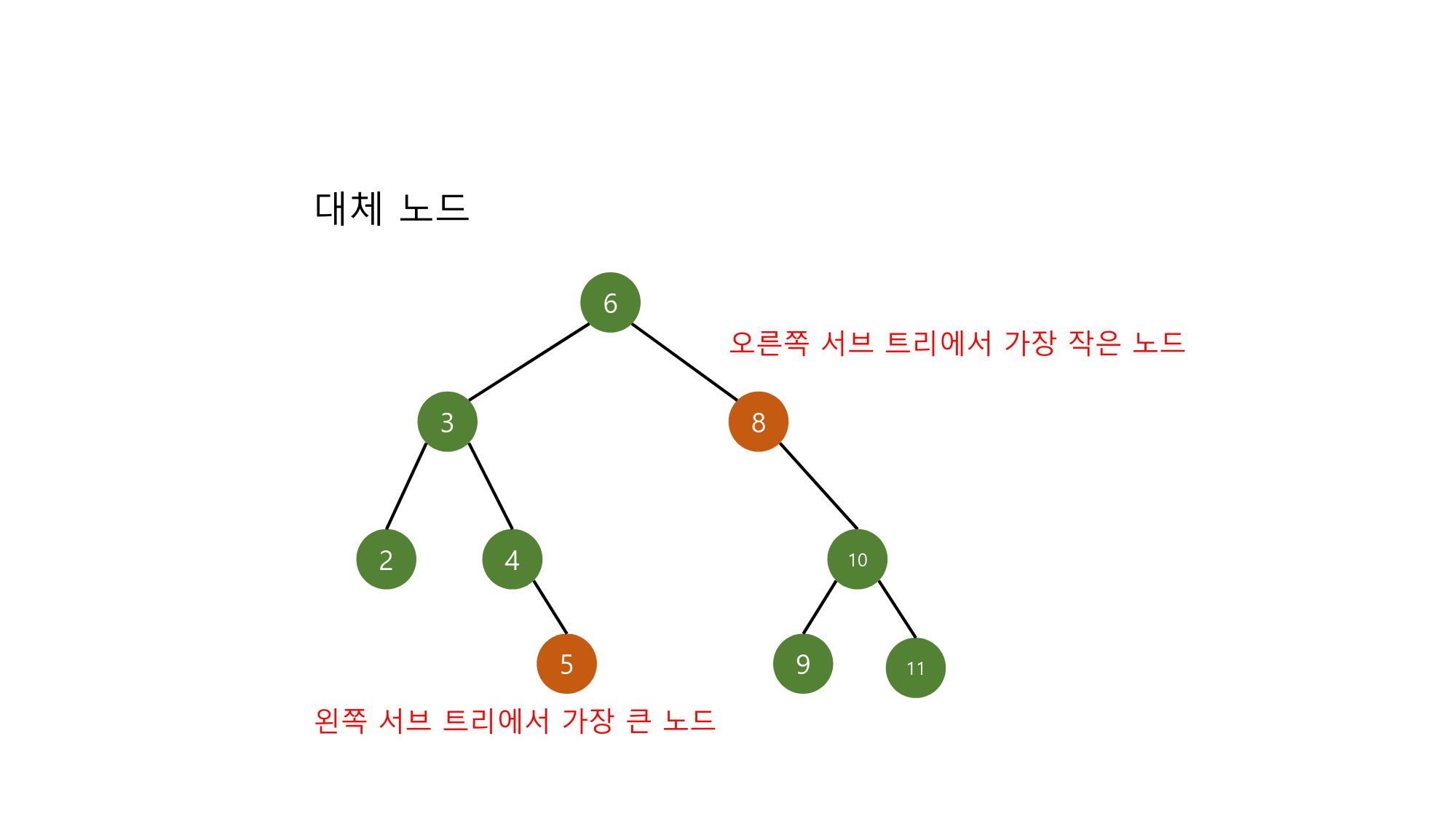 삭제시킬 노드의 오른쪽 서브 트리에서 가장 작은 값이 대체할 수 도 있습니다.