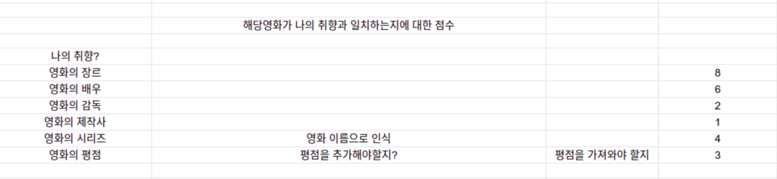 선택된 영화의 정보와 찜 목록에 있는 영화들의 정보의 일치 정도를 점수화하는 단계까지 구현되었고