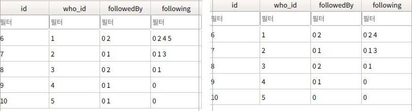 User 테이블의 id 값이 1인 유저 (who_id = 1)가 id값이 2, 4, 5번인 유저를 팔로잉하고 있다가 (왼쪽 그림)